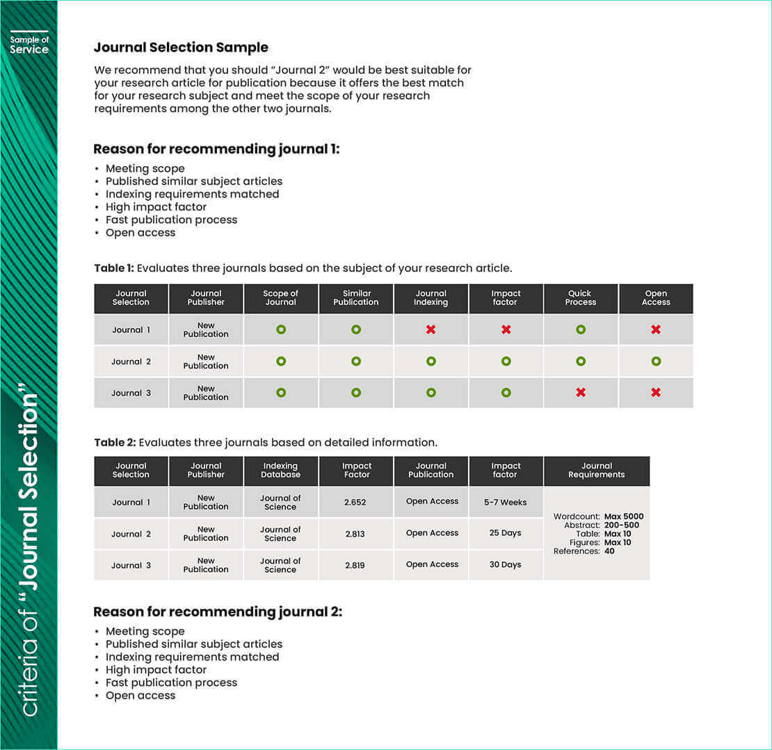 Our journal selection process explains how we recommend the best journal according to the research niche or requirements for the researchers' satisfaction. Our journal selection sample will help you select the most appropriate journal, we have compiled essential aspects that must be considered while selecting a journal.